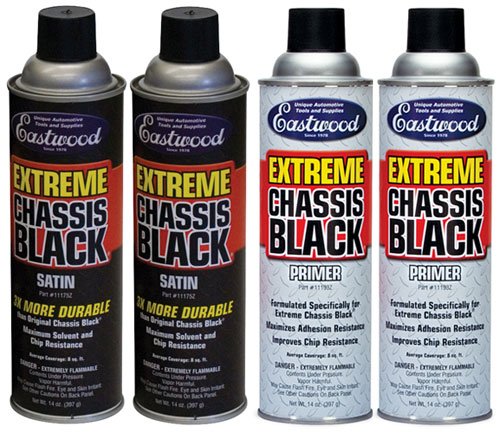Satin Extreme Chassis Restoration Kit With Extreme Chassis Black Primer. Enough paint to cover most front subframes or up to 20 square feet with a double coat.