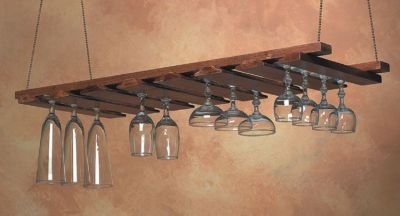 Can be hung from ceiling with brass plated chains (included) or mounted under bar or countertop. Sturdy construction with 3/4" slats. Walnut finish. 28 glass capacity.